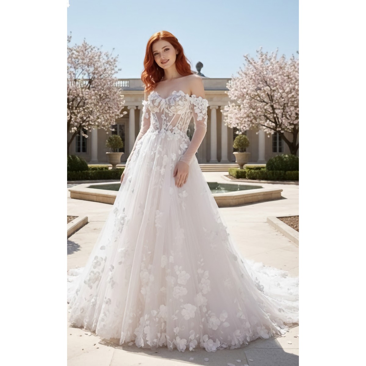 - Detachable 3-D flower sheer fitted long sleeves