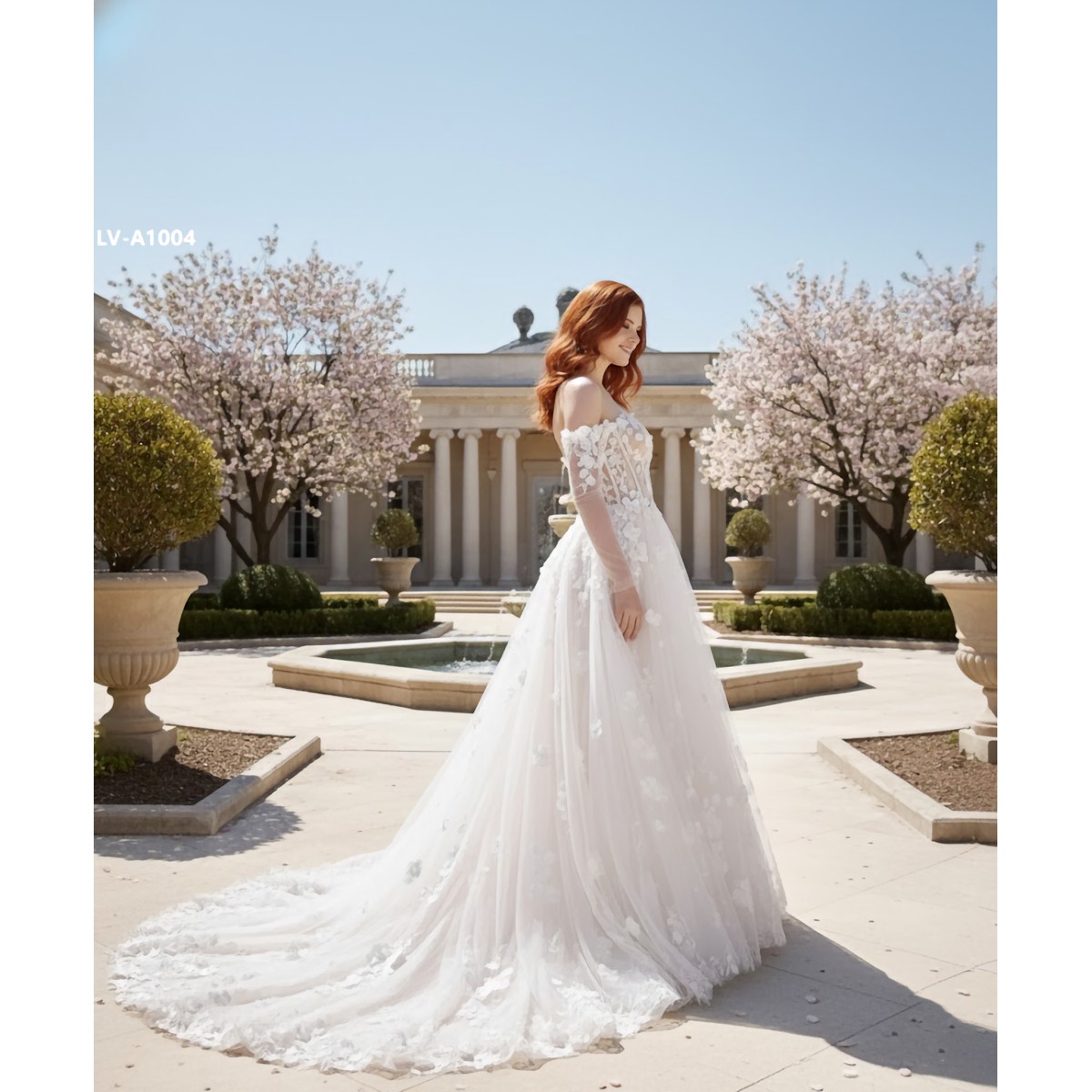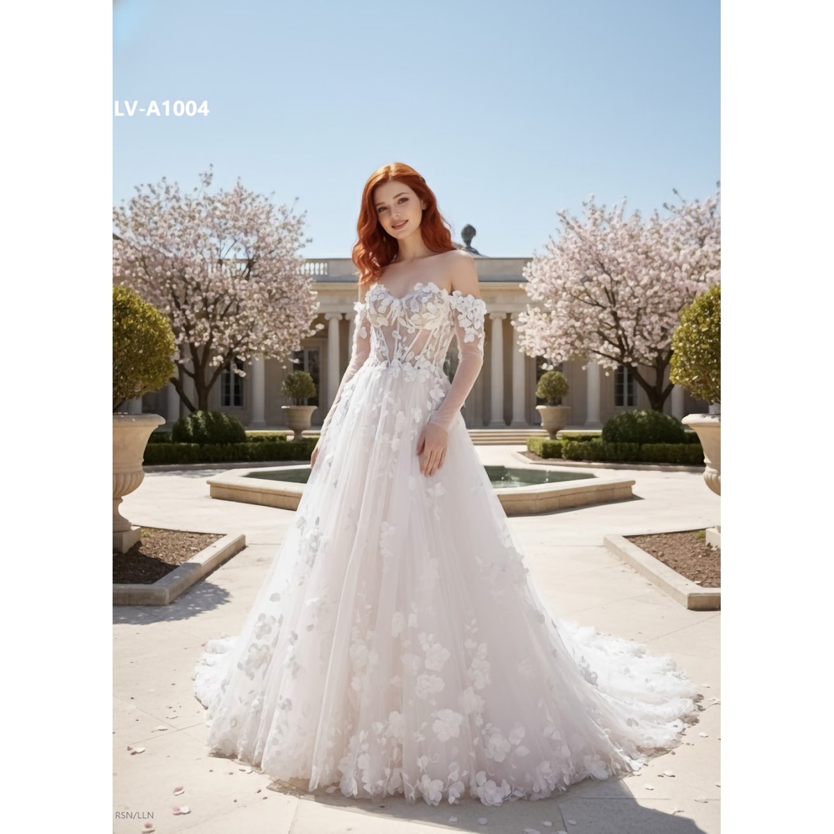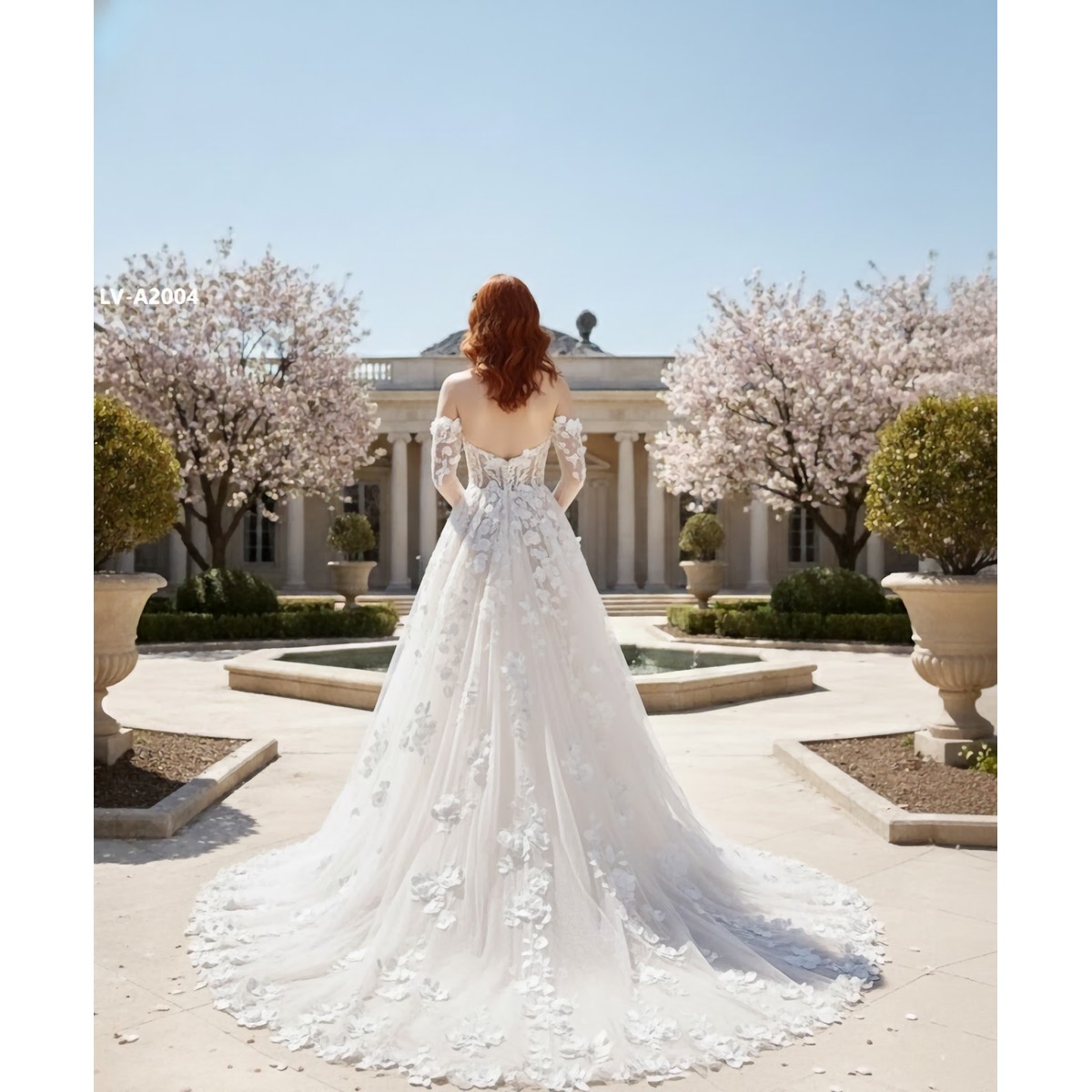 A-Line 3-D Flower Lace Wedding Dress with Bustier Bodice- LV-A1004DS