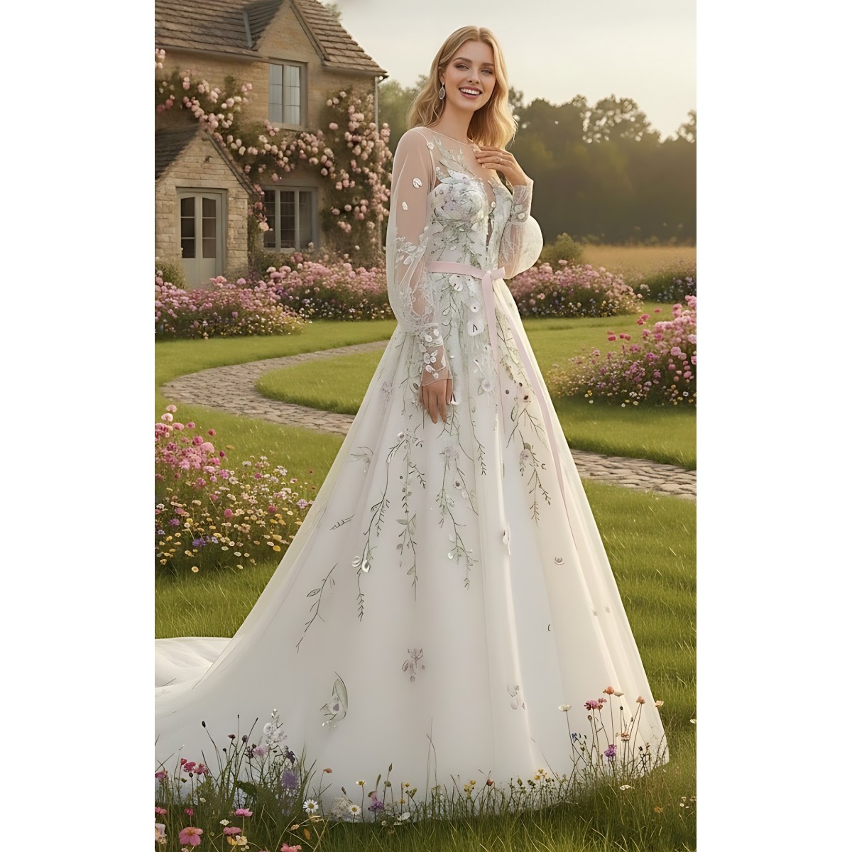 Ball Gown Pink Color Embroidery Floral Lace Appliqued Tulle with Sheer Lacy Bishop Long SleevesWedding Dress - MO-B6003