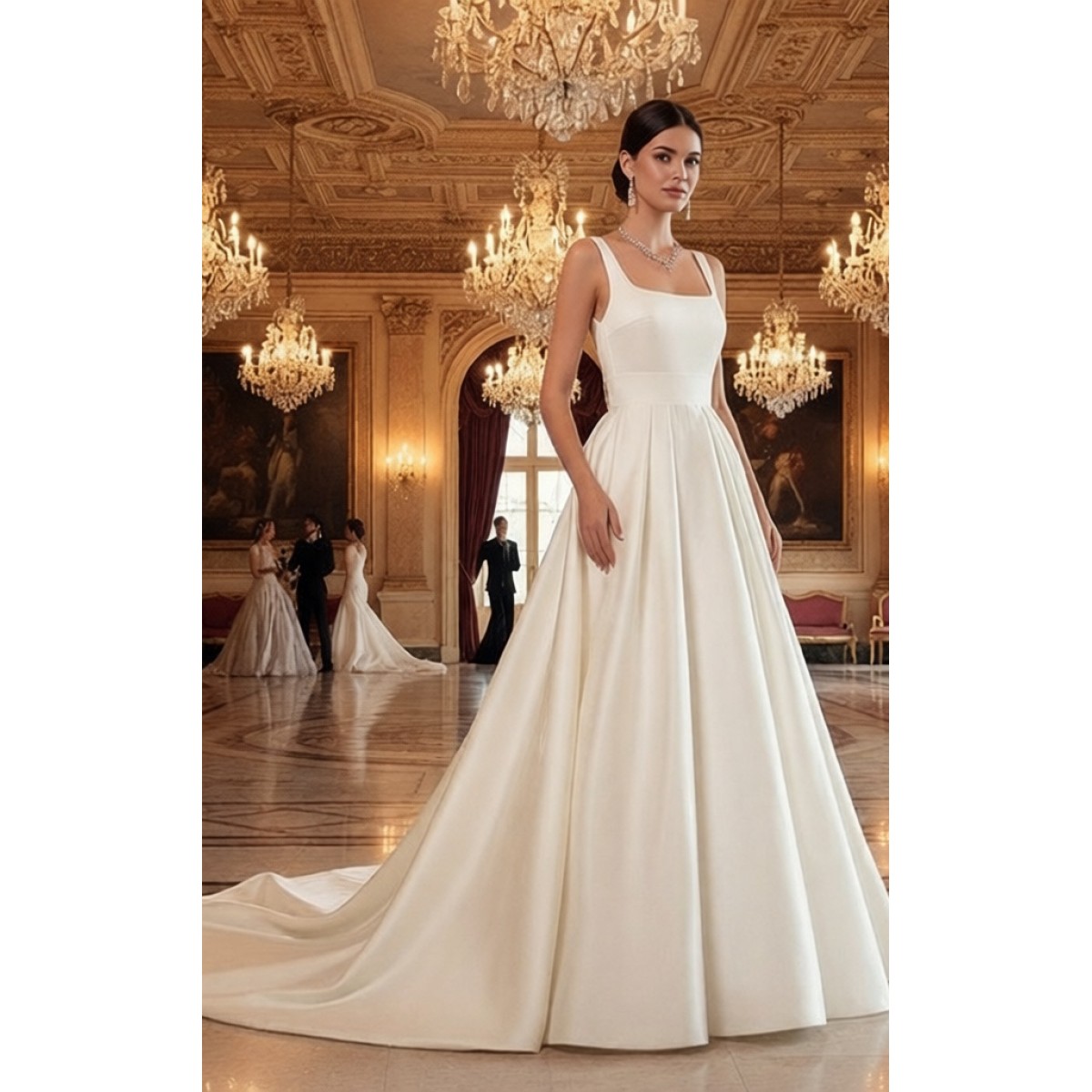 Tags: Square neckline, Satin A-line