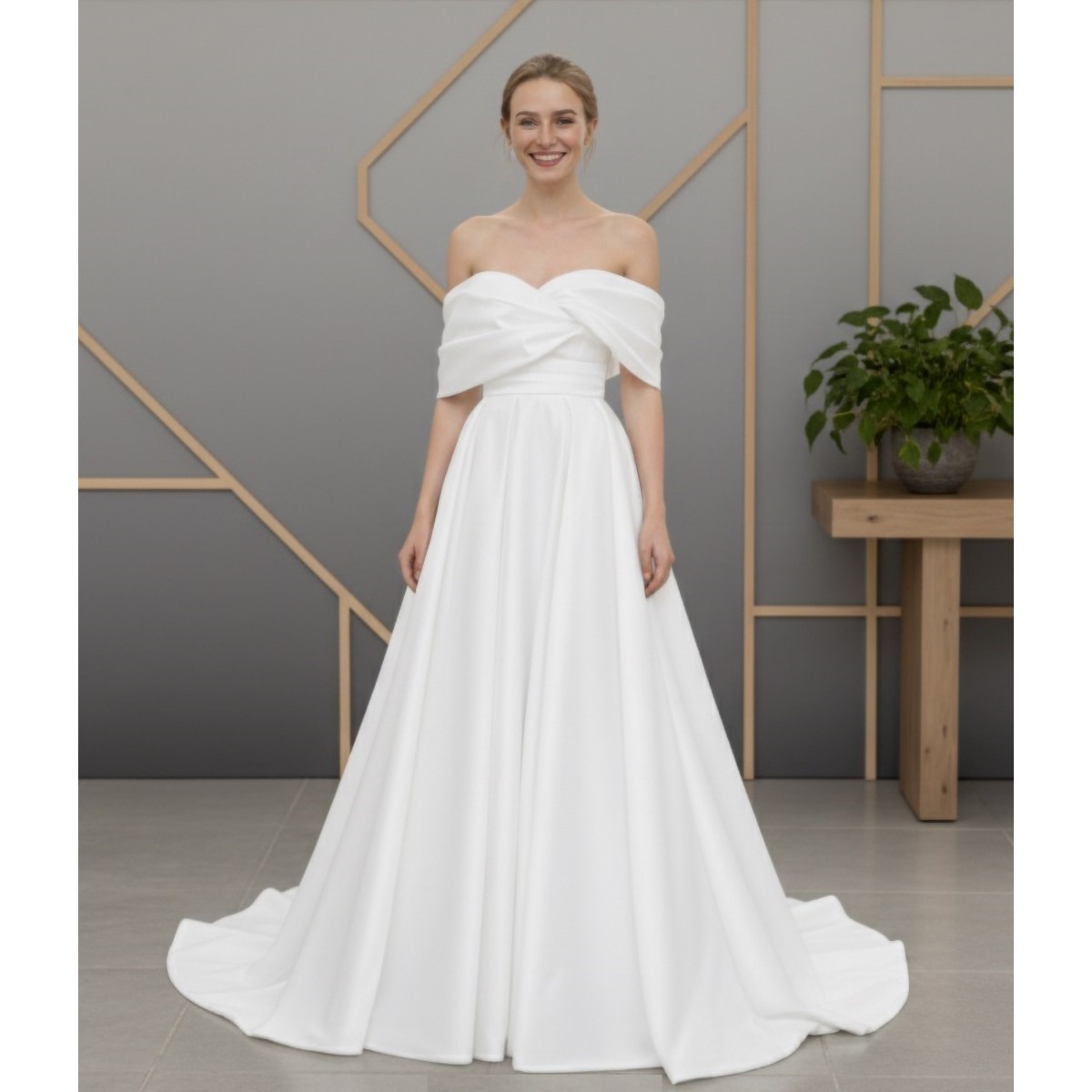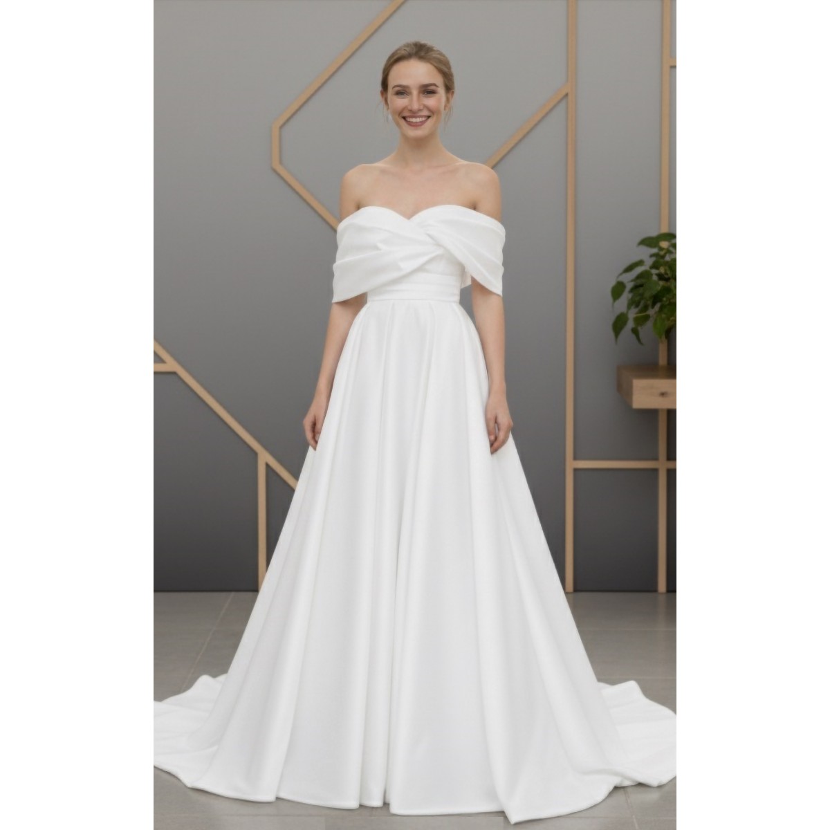 This ethereal bridal A-line radiates romantic elegance with a flowing organza A-line skirt and a structured ruched off-the-shoulder bodice. The design is both classic and whimsical, featuring graceful bishop sleeves that gather softly at the elbow. The back is finished with a stunning lace-up corset detail, ensuring a custom, flattering fit that cinches the waist and adds a timeless, regal touch. Perfect for a grand fairytale wedding or a chic, romantic ceremony.