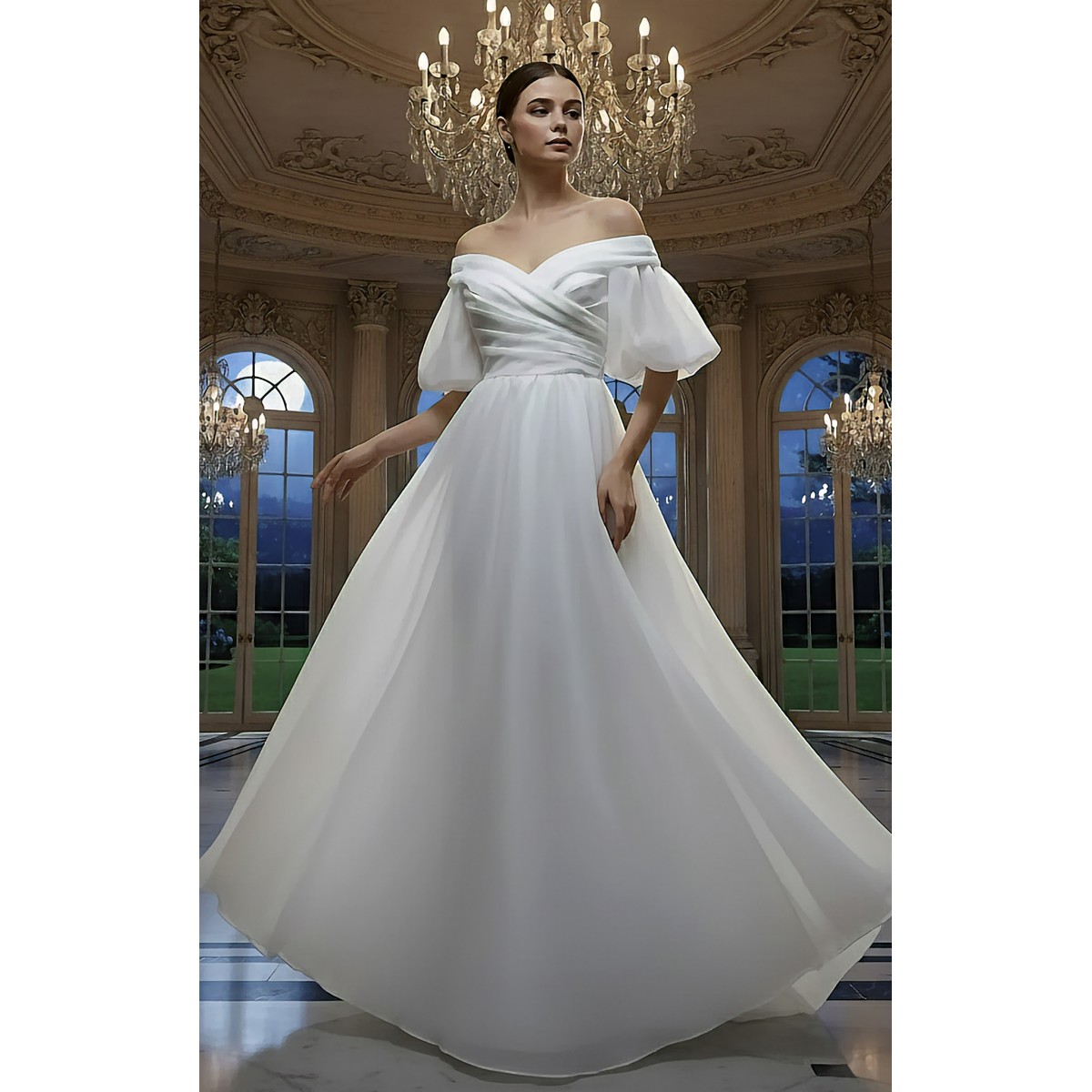 The design features a graceful off-the-shoulder neckline with beautifully draped fabric that highlights the collarbone and shoulders. The fitted bodice cinches at the natural waist, creating a flattering, elongated look, and flows into a dramatically voluminous skirt. The back view reveals a clean, structured line and culminates in a magnificent chapel-length train, ensuring an unforgettable walk down the aisle. Perfect for the bride who desires a polished, classic look with a touch of contemporary flair.