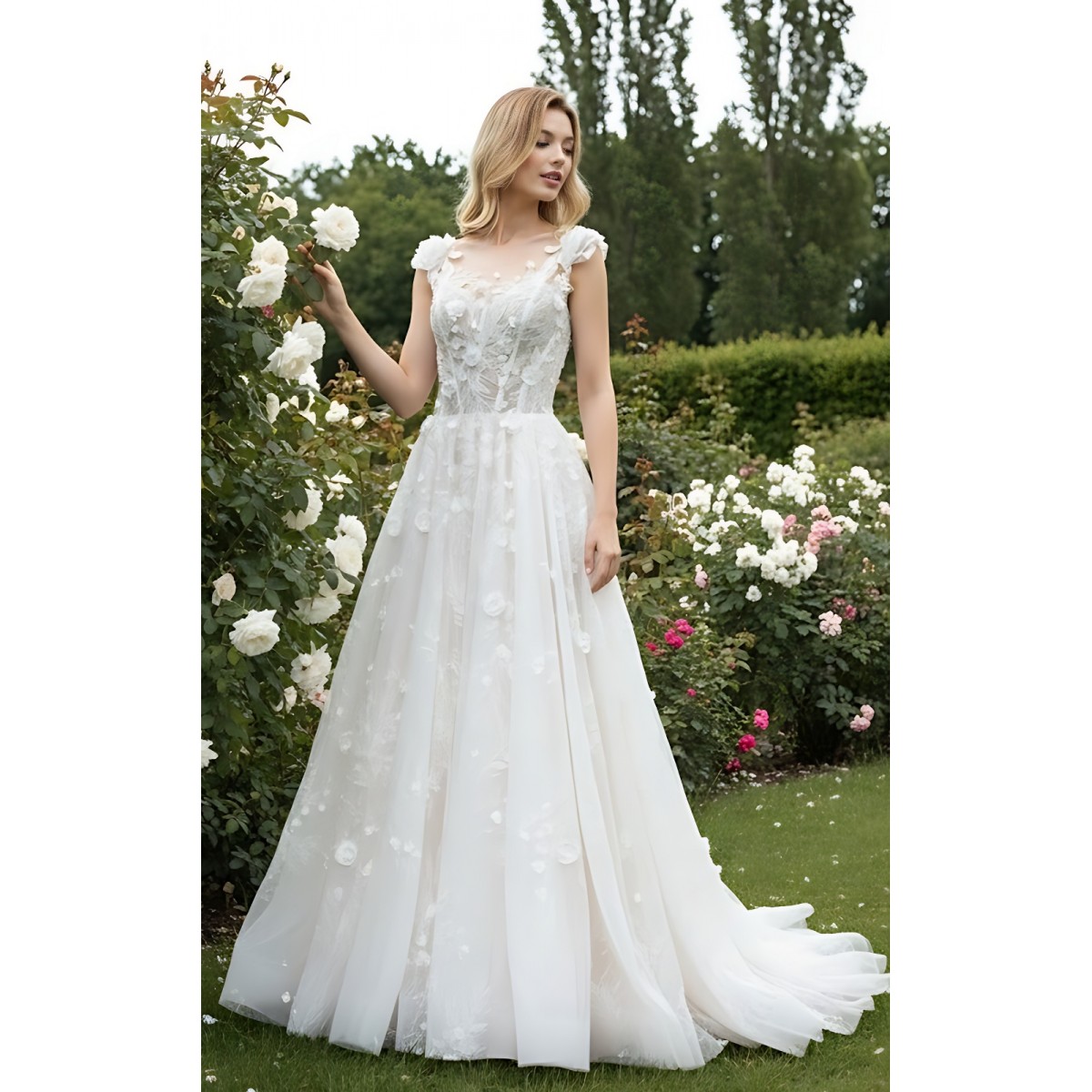 Wedding Dress - 3-D Beaded Floral lace Applique Tulle A-line with Handmade 3-D Roses Neckline- LV-A3005