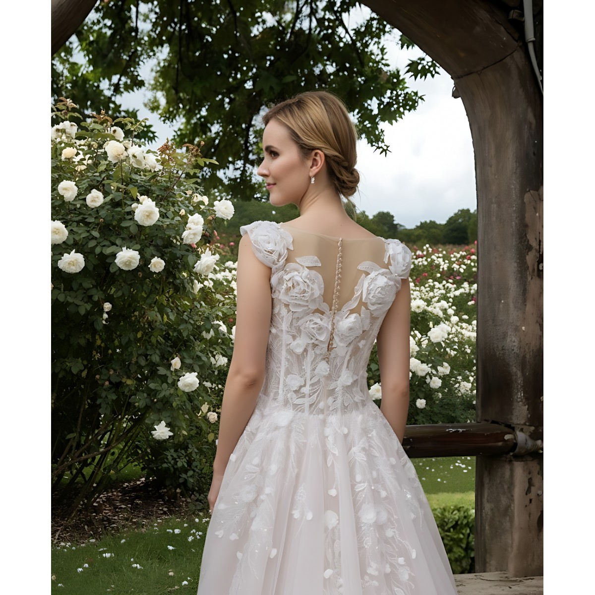 - Handmade 3D chiffon roses along the neckline and backline