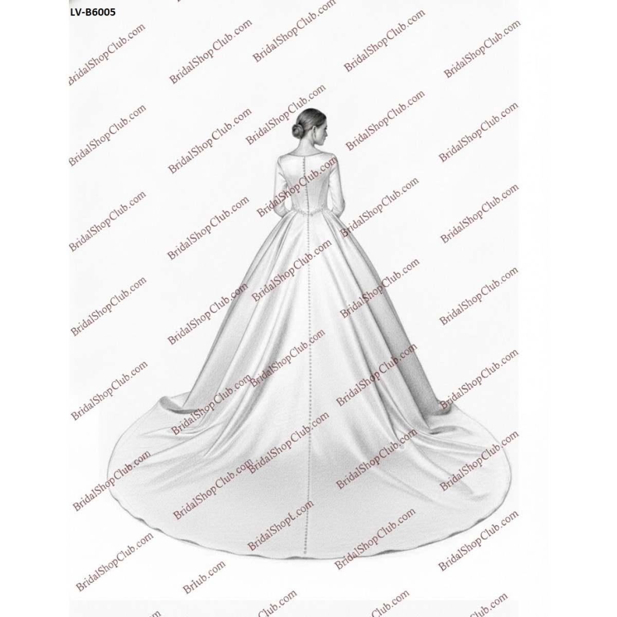 The skirt descends into a voluminous, full ballgown shape, made from the same rich matte satin, culminating in a magnificent cathedral-length train for a truly dramatic and unforgettable entrance. The back of the gown features a row of satin-covered buttons running the entire length of the train, completing the regal look. Perfect for the bride seeking a modest yet impactful, timeless gown.