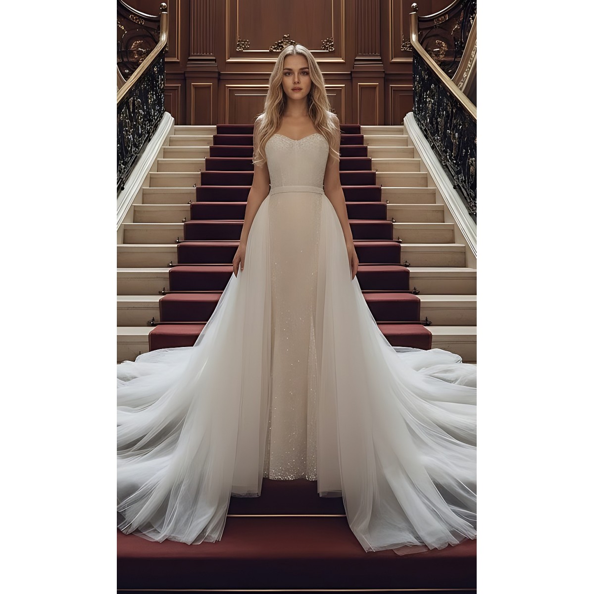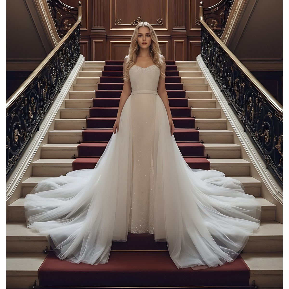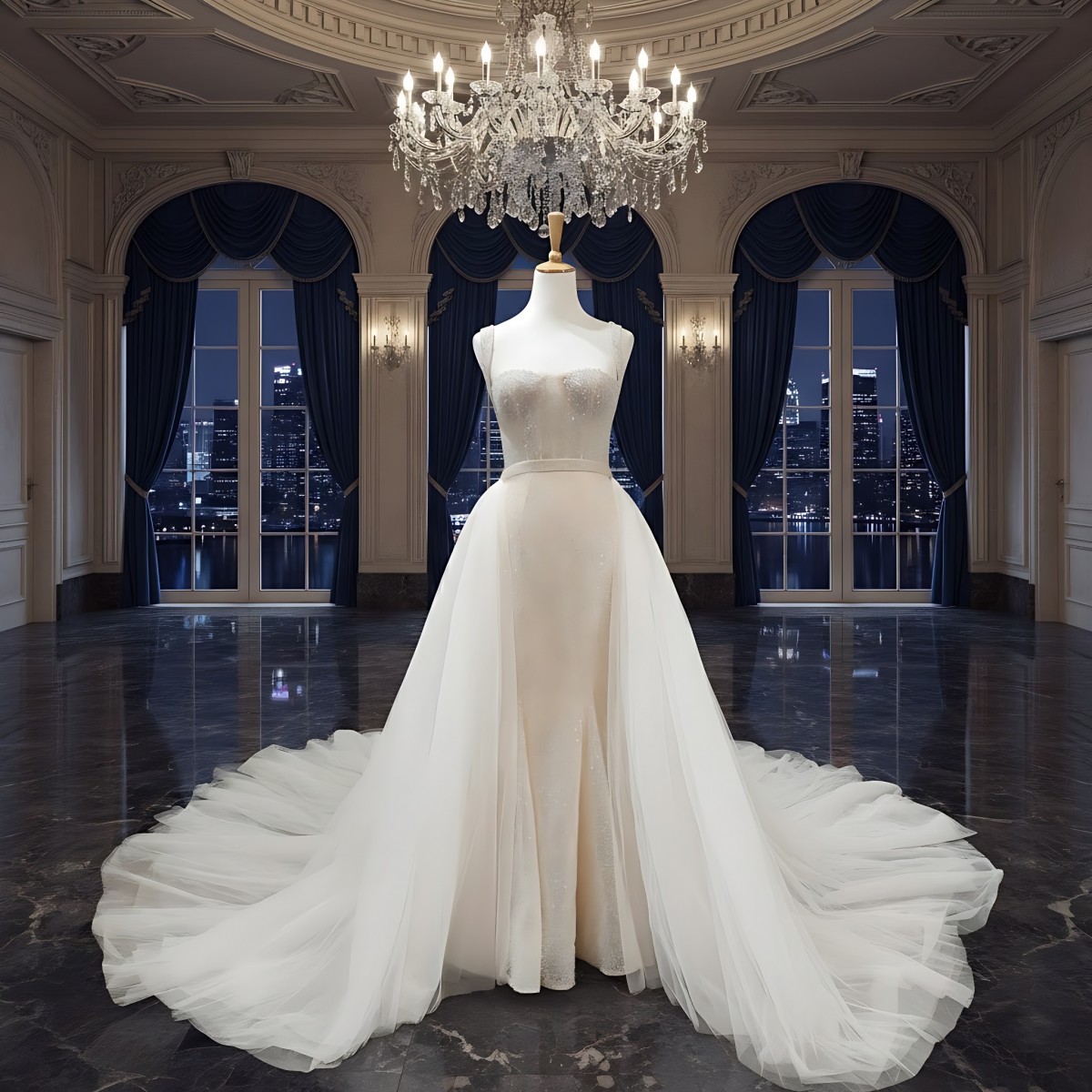 Mermaid - Heavy Beaded and Sequined Wedding Dress with Detachable Tulle Overskirt