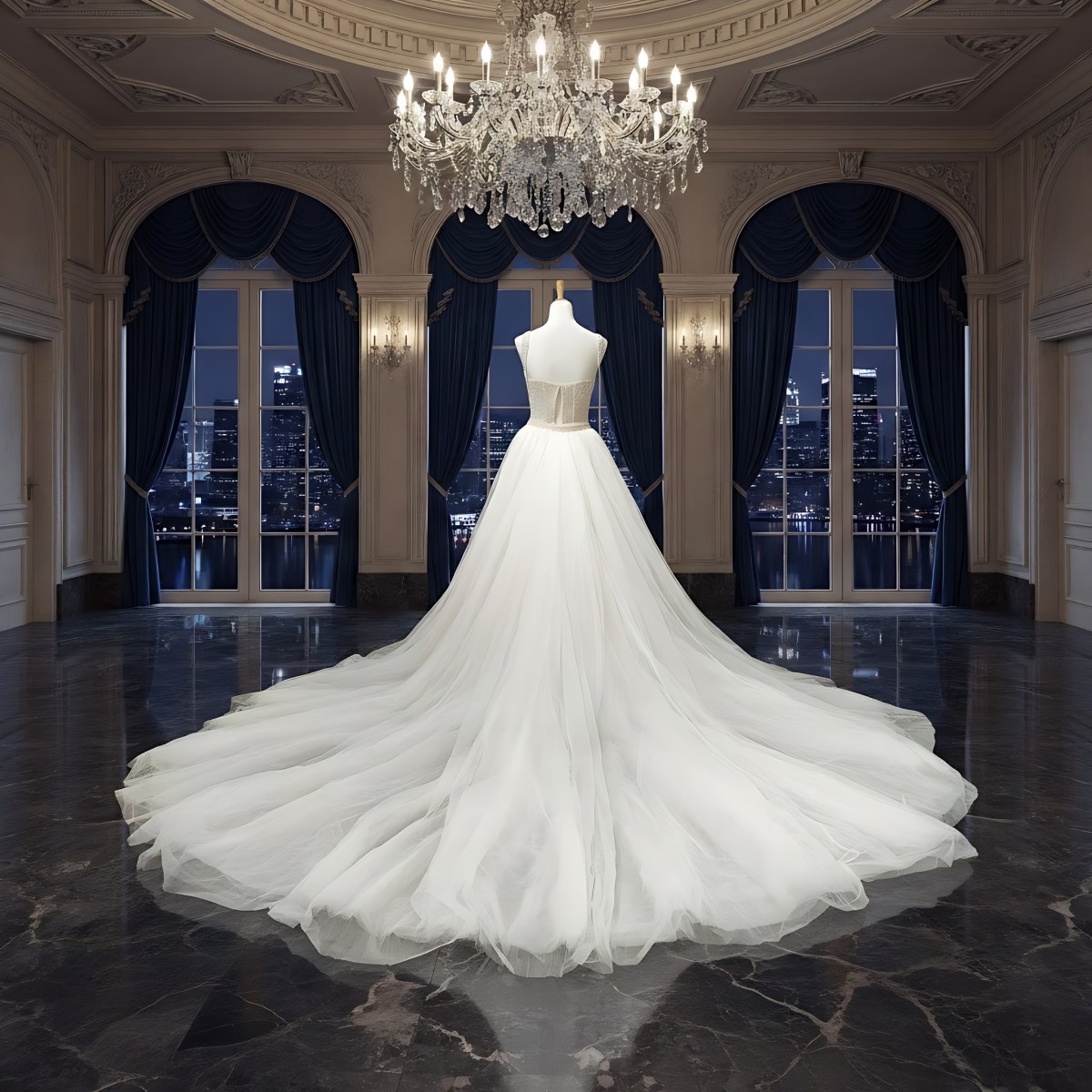 - Horsehair trim on the hems of the skirt and train