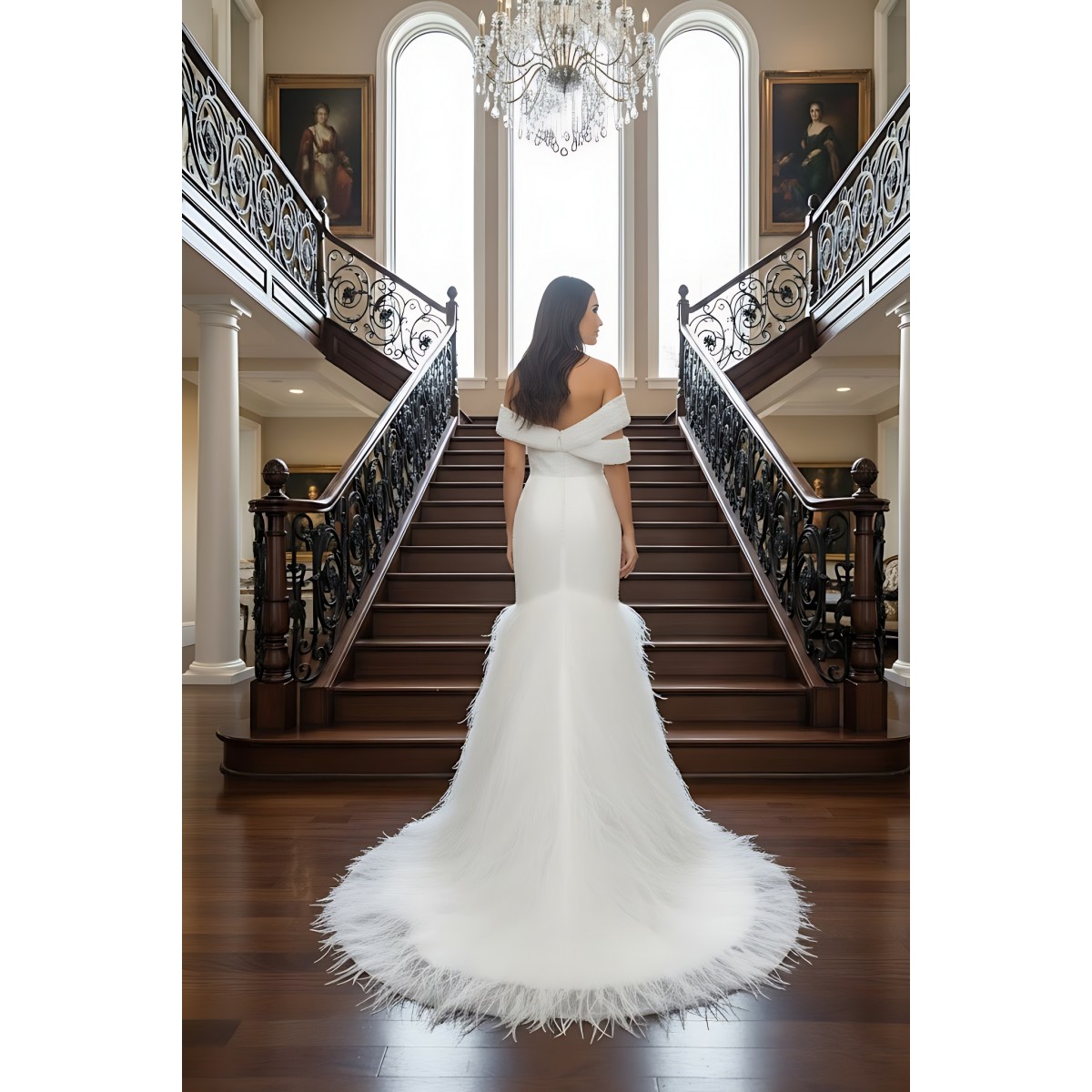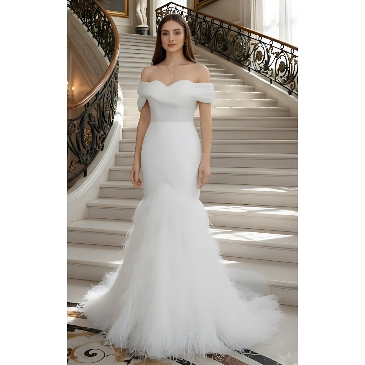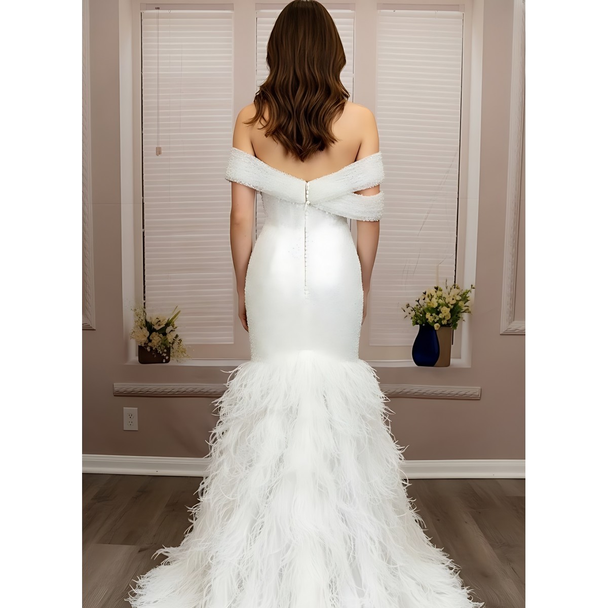 Wedding Dress - Beaded and Sequined Tulle Mermaid with Feather Skirt- LV-M5002F