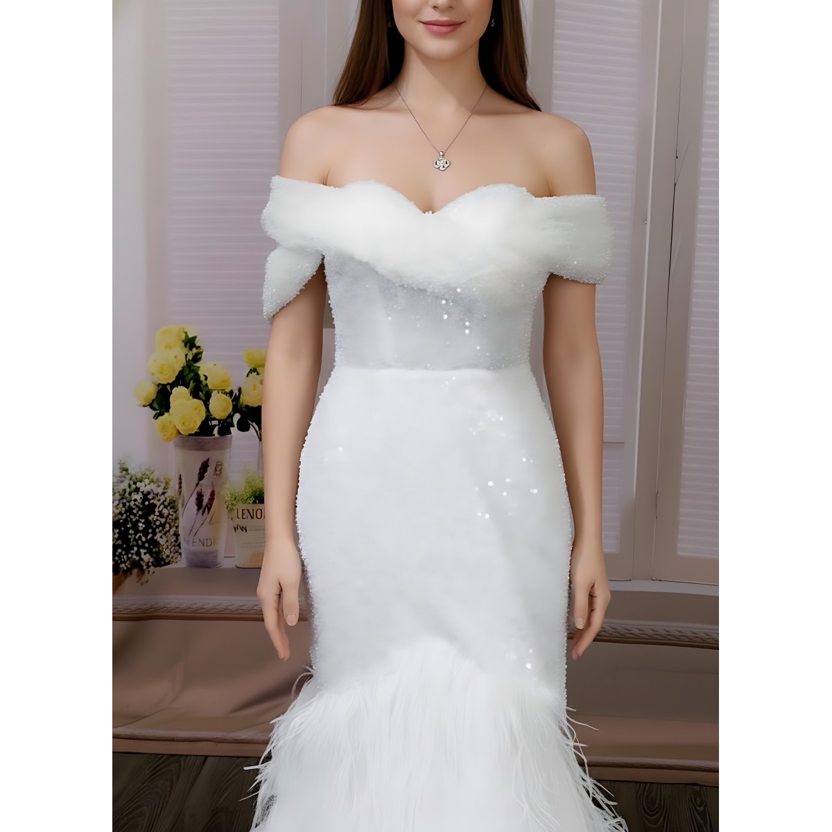 • Material:  A+ quality beaded and sequined tulle /Feather