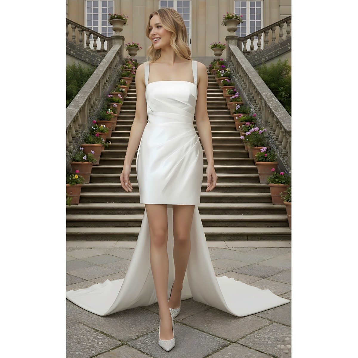 Wedding Dress - Satin Pleated Mini Skirt with Detachable Train - LV-R1001
