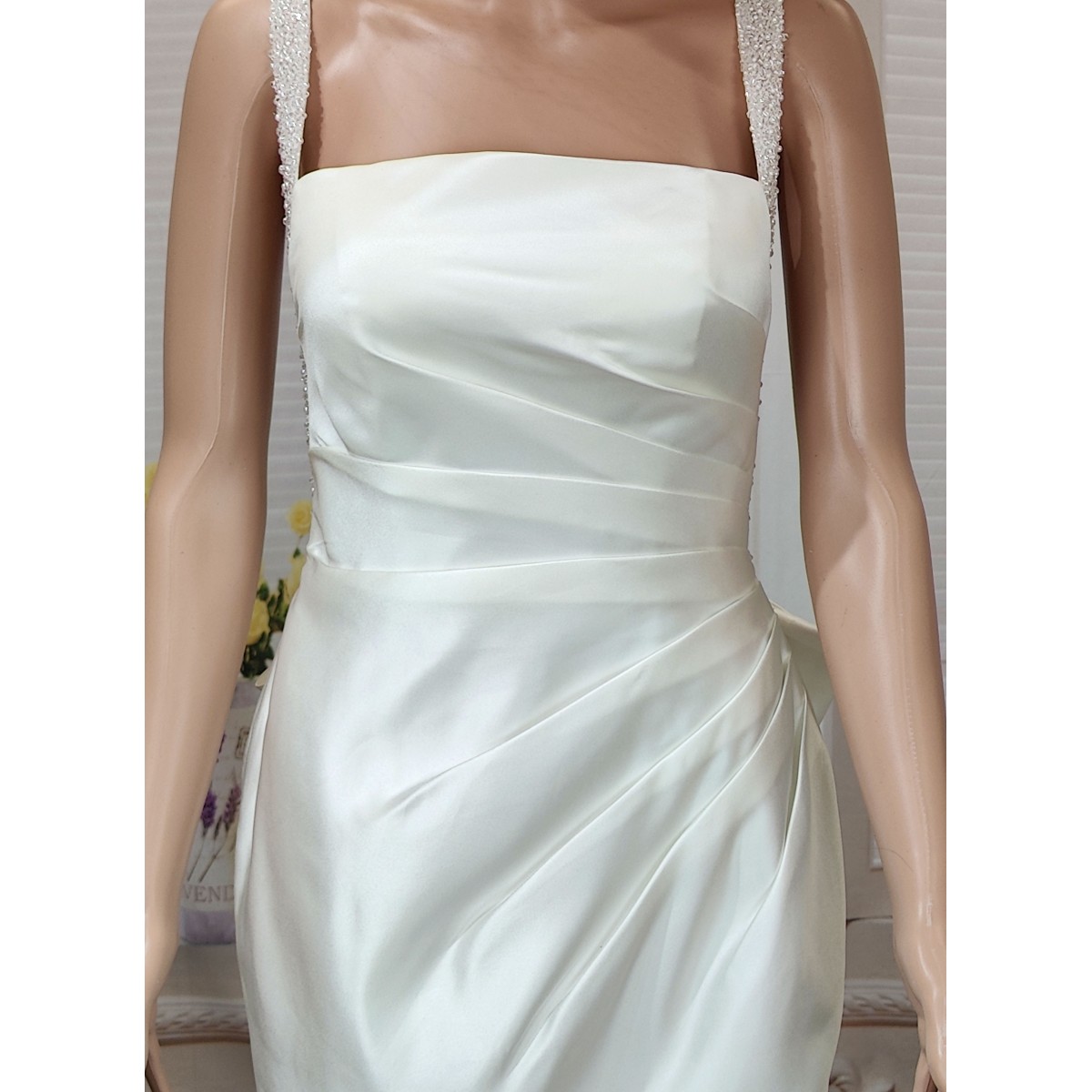 - Pearl beaded Straps along the sides of the bodice to the waist