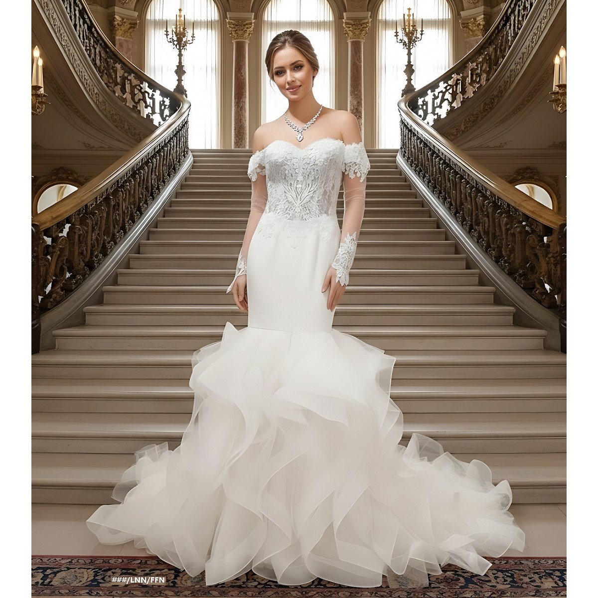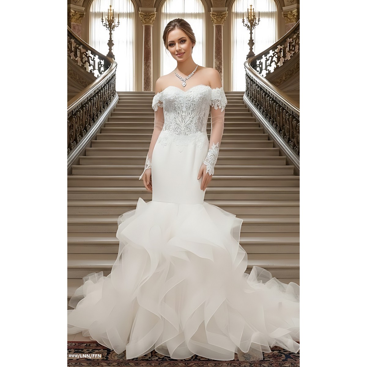 Tags: Mermaid, Sweetheart, Off-Shoulder Straps, Detachable Sheer Long Sleeves, Ruffle Skirt