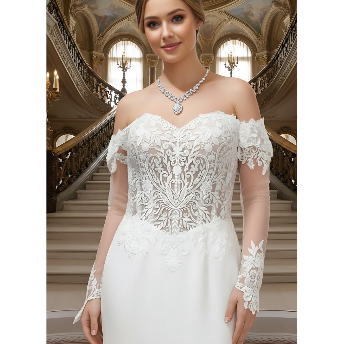 Mermaid Tulle Off-Shoulder Ruffle Skirt with Detachable Finger Ring Sheer Long Sleeves Wedding Dress - MO-M4005