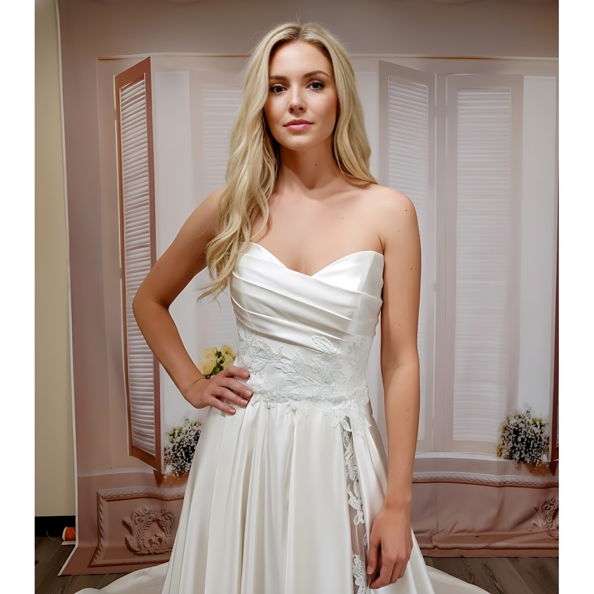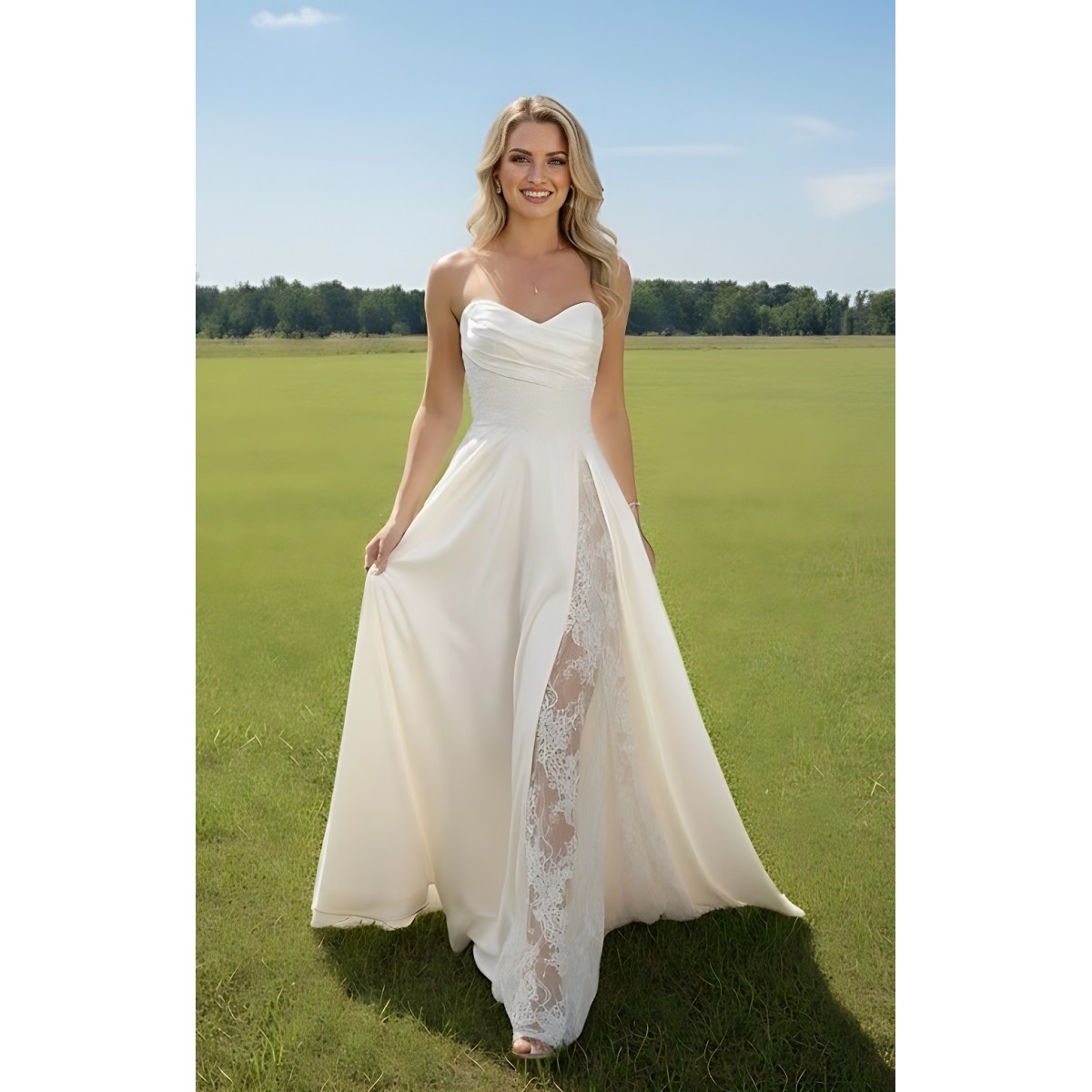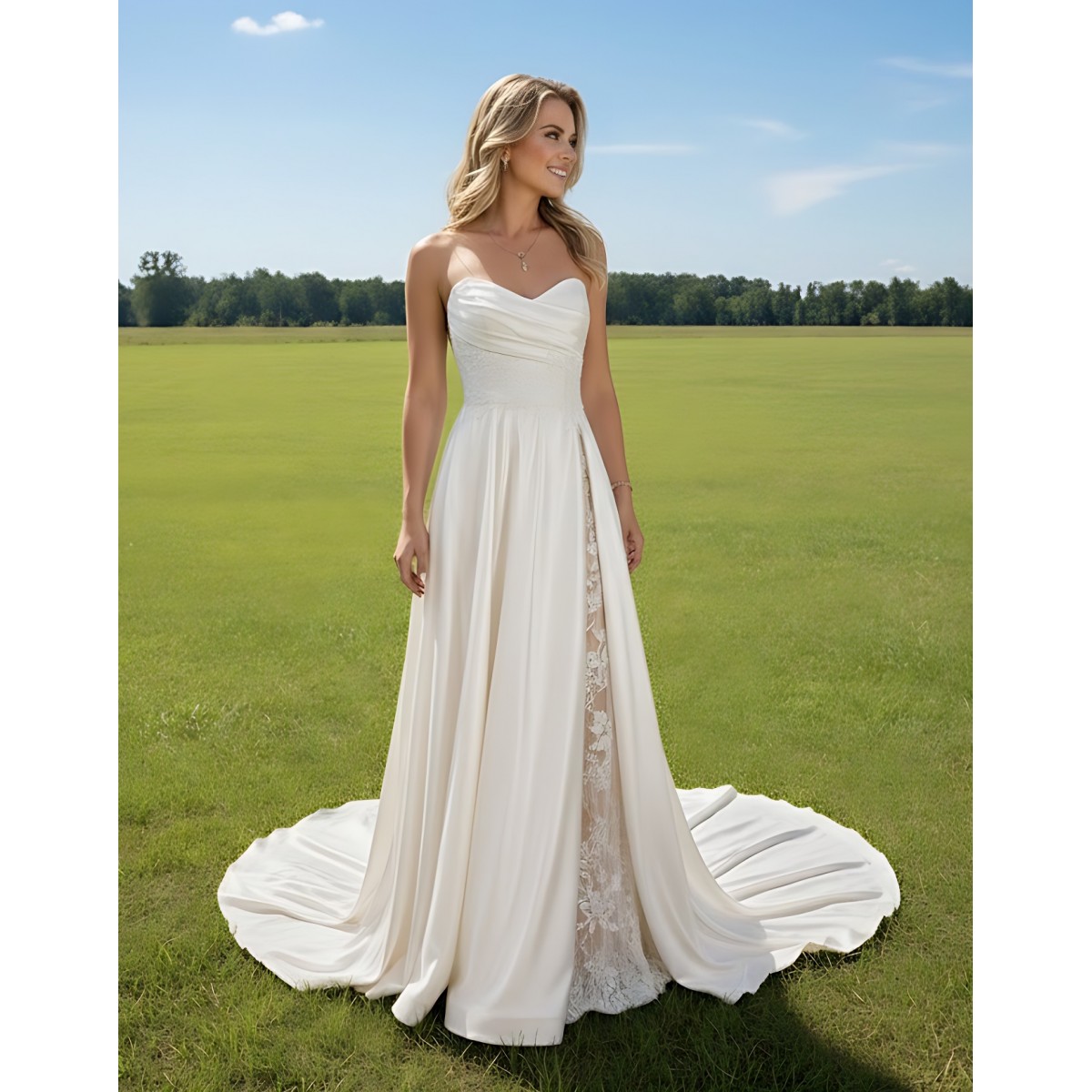 A-Line Soft Satin Pleated Sweetheart Slit Skirt Wedding Dress with Beaded Lace Appliques - OU-A1007