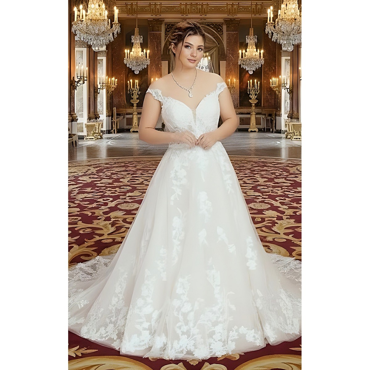 • Sleeves: Sheer Cape with Lacy Trim Off-Shoulder Look