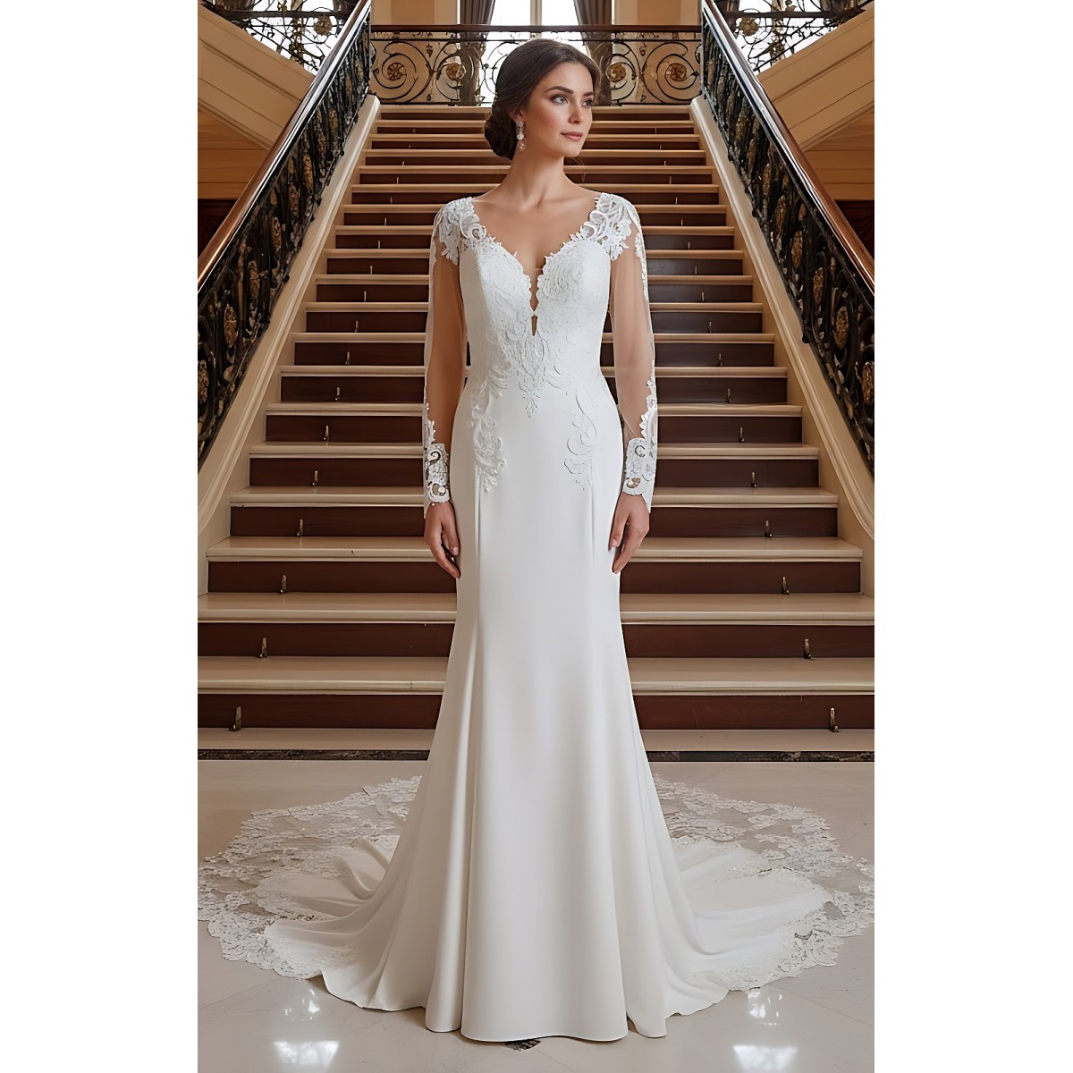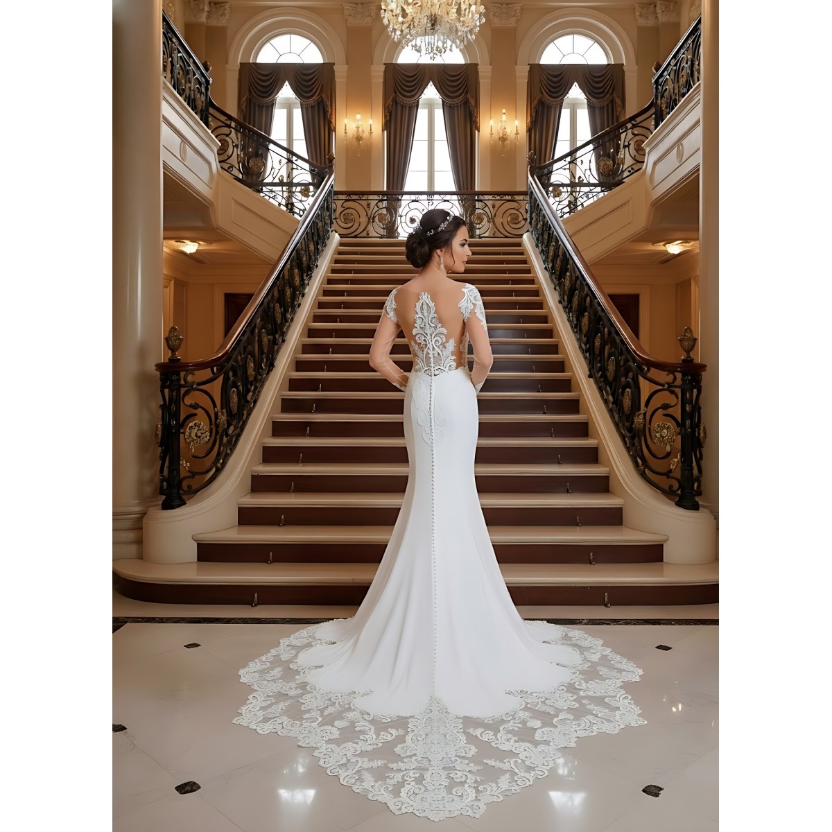 Fitted N Flare Crepe Wedding Dress with Lacy Cut-Out Train - LV-M6005